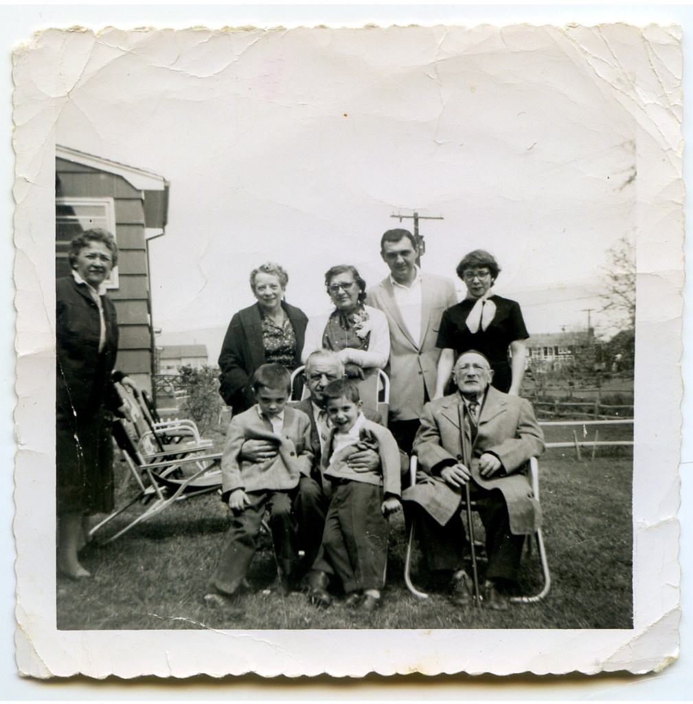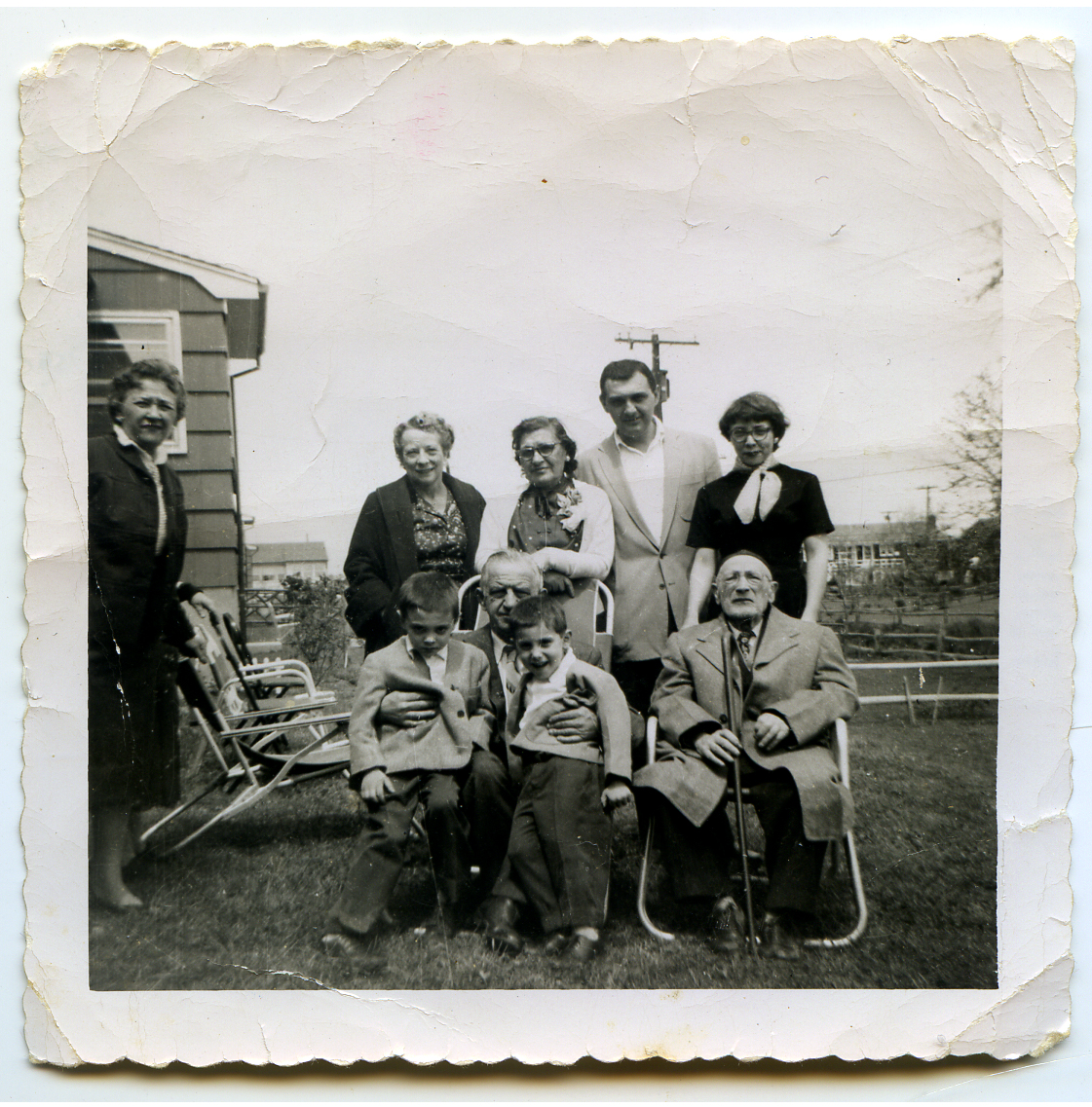 This photo was taken in 1955, in the New York area. My brother Dave and I are sitting on Isaac’s lap. Seated to our left is Berel. My mother and father and two grandmothers are standing behind. The woman at the left is unidentified, possibly one of my aunts.