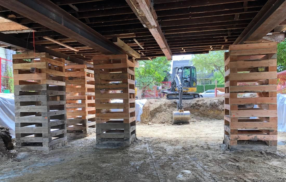 After initial bracing, the building was raised using hydraulic jacks and put on cribbing.