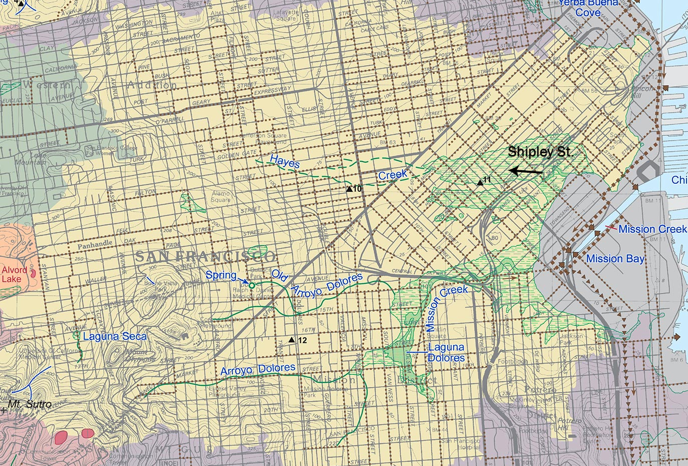 We eventually dug down to the little creek that still flowed under that part of SOMA. (Apparently part of Hayes Creek, which flows into Mission Creek.)