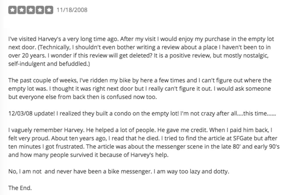 “It is Friday night. And, like the rest of San Francisco’s workers, the bike messengers head to their hangout, a grimy South of Market alley off Fifth Street, where their paychecks are cashed by their guardian angel and their dreams of the future have a brilliance that only a Friday night can bring. At least a couple hundred of the city’s approximately 400 bike messengers swarm, like bees to a hive, to Shipley alley, a narrow corridor between Folsom and Harrison streets, to let off steam after a week of dodging double- parked trucks, cars barreling through yellow lights and jay-walking office workers, their faces buried in their watches. Here, next to the alley, lives the man they call the Patron Saint of the Bike Messengers. Harvey Woo is the 49-year-old owner of Harvey’s Place, a little grocery store/lunch counter. In an era of bland chain superstores, Harvey’s is a relic: a first-names-only, family-run joint. As they say in the alley, “If you’re about to starve, you go to Harv.”