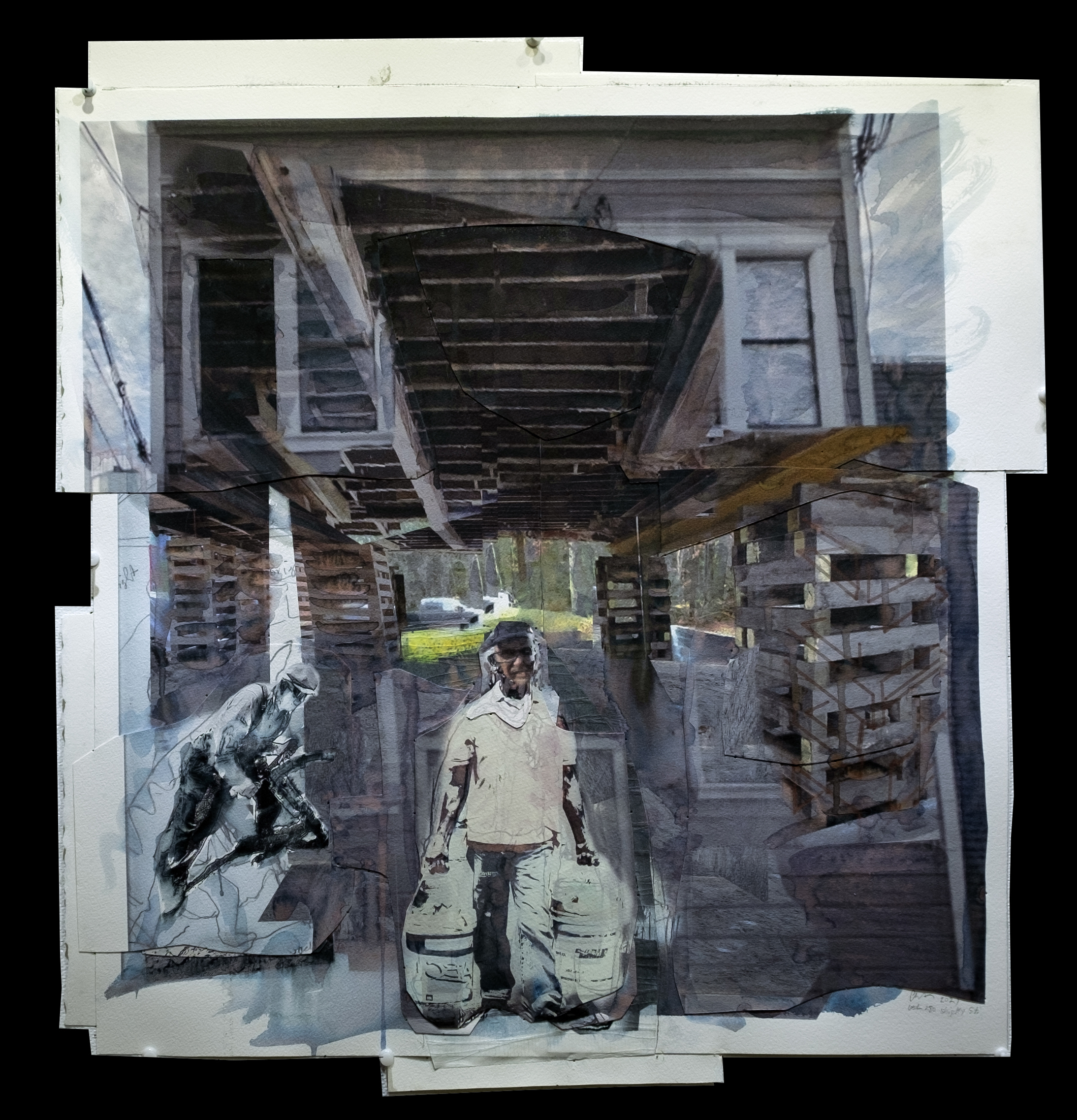 Artist’s interpretation of work under 280 Shipley Street. Photo collage on water color paper, water color, 2021. 23″x24″
