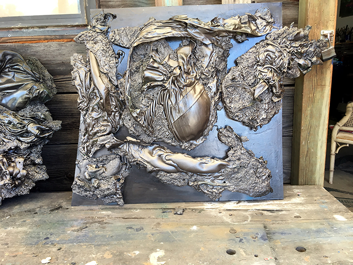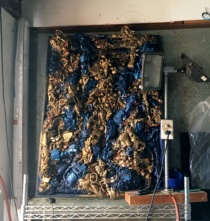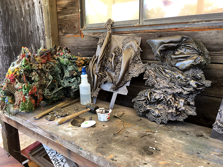 I walk around the neighborhood a lot and would often walk down Orchard Street hoping to see the garage door of Patrick’s studio open. It wasn’t a big garage, and it was packed with art, but he had a space carved out to work in. Then he and Gael moved over to 4th Avenue, which was even closer to our house. Again, I’d walk by and frequently encounter Patrick in front of their place. Long conversations would ensue. His last studio was out at the Art Farm on Grove Street. I visited him there in 2019, hung out talking, and bought a small painting (below).