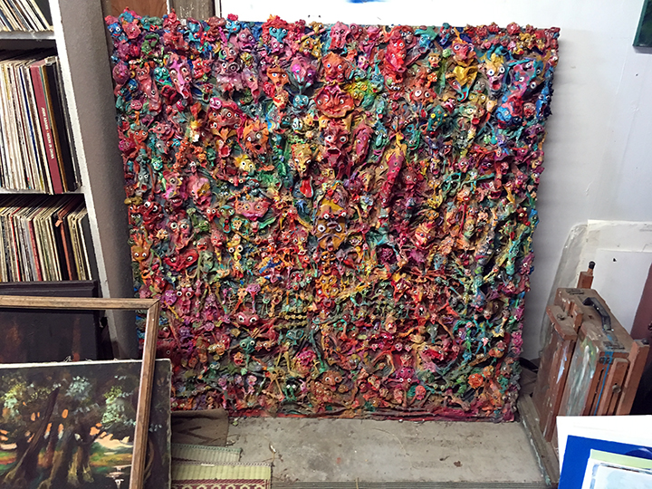While he’s painting, you might say that’s where his is-immersed in a strange land. But while some of his paintings are haunted with elusive characters, other depict life in a whimsical cartoon world. (These works ought to be accompanied by some of avant-garde singer Frank Zappa’s tunes, the artist says.)
