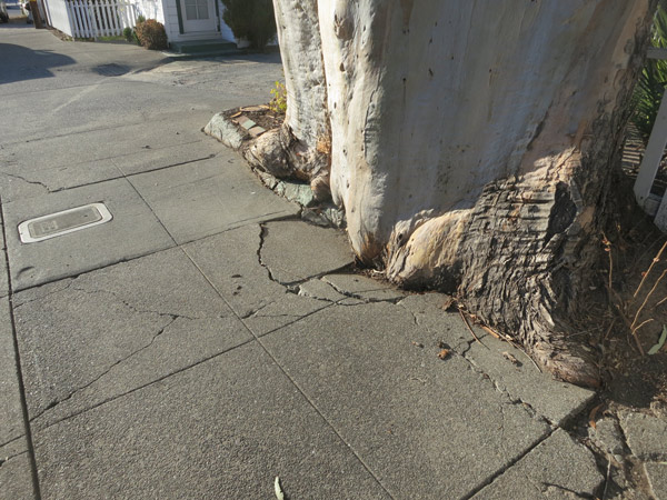 This tree was planted in a wine barrel in the parking lot of the Fruit Basket, probably within the last ten years. All that is left of the barrel are the steel straps.