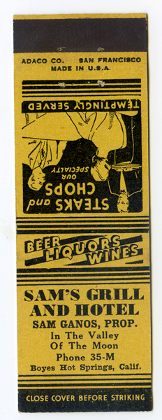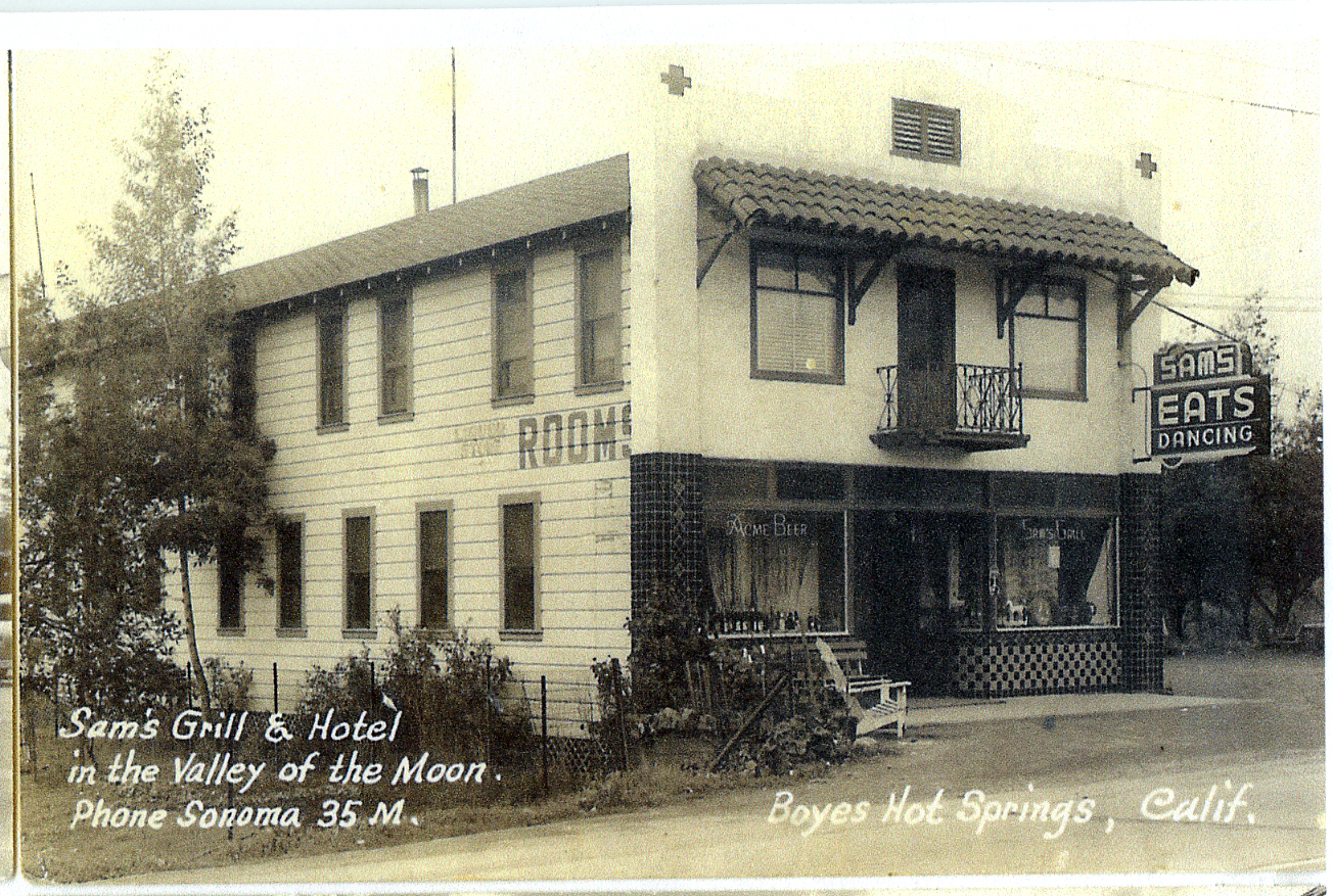 The building is on Lot 23 of the “Boyes Springs Hotel Grounds” purchased from E. Anagitos by Sam Ganos 5/24/1922. Anagitos got it from the Boyes Hot Springs Hotel (a development company) in 1916. The Assessor’s map (“tank maps”) shows Lot 23 as “grill” (as shown in the post card). This is before the fire of 1923. In the Index Tribune Feb 3, 1939, “Sam Ganos Improves Place to Keep Pace With City…” Sam Ganos, one of the original Boyes Hot Springs boosters and who saved his grill from the big fire of 1923 by pouring the famous Springs water on the roof when it was all but doomed [my emphasis], has steadily improved his place and now is installing a fine front and back bar…”. Very few buildings survived that fire. That makes 17960 a historical resource, in my opinion. Sept 28, 1961, “Sam Ganos in Hospital… Sam Ganos, pioneer Boyes Hot Springs businessman and a leading property developer of the area… His wife Lillian and son Mendel are carrying on the business at Mendels’s Café in Boyes.” Mendel’s was in one of the Boyes Blvd. “spur” buildings, next to what used to be Uncle Patty’s(across the street from the Plaza Center). Sam Ganos died on July 4, 1963. His wife Lillian inhereted. Her house was on the site now occupied by the Valley of the Moon apartments.